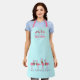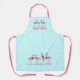 Flamingos bib apron with pink text on pale blue. Use for a business kitchen, or coastal home. Four flamingos at the top of the apron and four, larger flamingos at the hemline. They wear floral wreaths and stand among little blue sea stars. Pink ties match the flamingos, or change the colour as you wish.