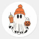Festive Ghost with Pumpkin Basket & Iced Latte Classic Round Sticker