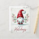 A charming watercolor illustration of a Christmas gnome, dressed in a cosy red hat, standing amidst delicate branches adorned with berries.