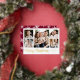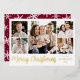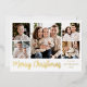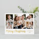 Modern foil holiday photo card featuring your favourite 5 photos arranged in a collage layout. Your custom greeting is featured in an elegant gold foil script with your family name and the year displayed to the right. The card reverses to display a mulled wine and white snowflake pattern.
