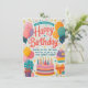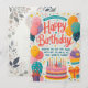 The card features a colourful and festive design with the phrase “Happy Birthday” prominently displayed in the centre. It is adorned with balloons, cupcakes, a birthday cake with candles, and a gift box. The background includes stars and dots, adding to the celebratory atmosphere.