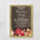 Festive holiday Christmas party invitation with a sparkly gold glitter sparkles border, red gifts with bows and elegant white writing on rustic dark brown wood. This is a perfect holiday/ Christmas/ winter invitation!