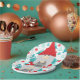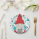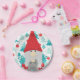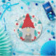 Super fun and cute for this holiday season. This design features a fun gnome with grey hair in two braids tied with red ribbons, in a tall red hat against a background of Christmas trees in shades of turquoise and red christmas balls.
