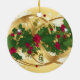 This ornament features a beautiful holiday garland made of lush green holly leaves, bright red berries, sparkling gold accents, and delicate white snowflakes. Flowing golden ribbons weave through the design, adding movement and a warm festive glow. The rich color palette of gold, green, and red gives the ornament a classic Christmas feel while still looking elegant and refined.