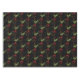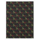 Elegant and modern holiday tablecloth features large holly leaves with swirls in green and red on black background