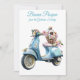 Beautiful light blue italian scooter decorated with flowers and Easter eggs. The scooter has floral patterns painted on its body, and there are flowers attached to different parts of the scooter, including the headlight and the front fender. On the seat of the scooter, there's a wicker basket filled with decorated Easter eggs and more flowers. The text at the top reads "Buona Pasqua," which means "Happy Easter" in Italian.