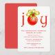Festive holiday corporate invitation done in white, with red graphic text, at the top, reading joy, where the o is replaced with a round red Christmas ornament. Red text, on the bottom half of this holiday invitation, is ready to personalise for your company's holiday party.