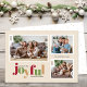 This photo Christmas holiday greeting card features the word "joyful" in a playful text and festive colours. The design offers space for three family photos on a very light cream coloured background.