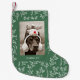 This stylish Christmas stocking features a sketched leaves pattern on a rich green background, with your own personal photo and name.