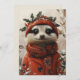 A delightful and whimsical illustration of a meerkat dressed for the winter season. The meerkat is wearing a vibrant red coat, a knitted scarf, and a cosy hat adorned with holly and berries, surrounded by snowy branches. The warm, festive colours and gentle snowfall create a heartwarming holiday atmosphere perfect for the season.