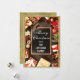 Festive Merry Christmas holiday card with a sparkly gold glitter sparkles border and red gifts with bows surrounding a black chalkboard on rustic brown wood. This card features the words "Merry Christmas" in an elegant hand lettered script, and your family surname in white.