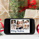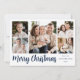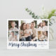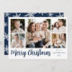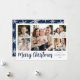 Modern holiday photo card featuring your favorite 5 photos arranged in a collage layout. Your custom greeting is featured in an elegant navy script with your family name and the year displayed to the right. The card reverses to display a navy and white snowflake pattern.