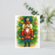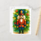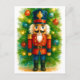 A classic watercolor Christmas postcard featuring a traditional Nutcracker surrounded by festive greenery and glowing holiday lights.