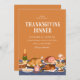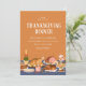 Celebrate the spirit of Thanksgiving with this festive orange invitation featuring a delightful illustrated dinner spread. The warm, inviting colour palette highlights a bountiful feast of turkey, ham, pies, and seasonal drinks. Perfect for hosting a cosy, food-filled gathering with family and friends, this invitation sets the tone for a memorable evening. Whether you're planning a casual dinner or a more formal event, this cheerful design is sure to delight your guests and get them excited for the holiday feast.