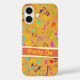 This case is adorned with a colourful confetti toss over an orange background. A yellow outlined orange ribbon allows the text to stand out from the design. Fill in the template field with your name/initial(s) or click customise to select a font style, size, and colour you prefer.