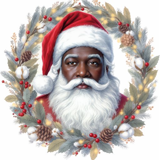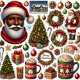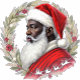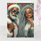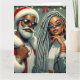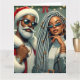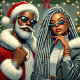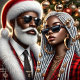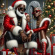 Santa and a companion are ready to celebrate, both wearing stylish Christmas-themed outfits. They stand against a backdrop of holiday lights and decorations, ready for a festive gathering.