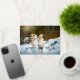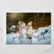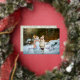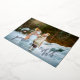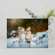 Holiday flat greetings card with your favourite photo featuring silver foil handwritten calligraphy lettering "Peace on earth" and snow.