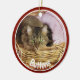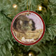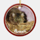 Pet photo Christmas ornament done in a round shape ceramic, with graphics red framed custom photo, on the front with white text. The back is done in red, green and white with graphic text reading Merry Christmas and a custom year your personalise. Add you pet's picture, name and the year for a great holiday ornament to remember your pet.