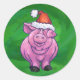 Festive Pig in Santa Hat on Green Classic Round Sticker