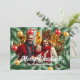 Celebrate the season with this delightful customisable Christmas flat card! At the heart of the design, a central photo area is beautifully framed by lush green pine branches adorned with shimmering golden and vibrant red Christmas balls. Imagine your own family photo replacing the cosy winter scene in the placeholder, adding a personal touch to your holiday greetings.