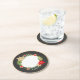 This drink coaster features a Poinsettia wreath with heart and star shaped cookies on a black background with a gold border.