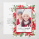 Usher in the holiday season with our Luxurious Festive Poinsettia Floral 'Merrily Married' Winter Holiday Card. Adorned with an elegant red poinsettia and holly berry design, this card exudes both warmth and jubilation of the season. The card has a modern style infused with traditional elements, making it a timeless piece. The single photo option is perfect for showing that memorable moment of the year or your newlywed status. 'Merrily Married', elegantly written in a modern calligraphy script, adds a touch of personal charm, capturing your joy and love in this festive season. The card is not only a festive greeting but a testament to your impeccable taste. The rich texture and colour palette give the card an extra layer of elegance, making your Christmas wishes stand out. Each card is meticulously crafted, ensuring a premium feel and look. The attention to detail and high-quality materials used, make this card a must-have for this holiday season. Designed by Simple Desert Designs Studio.