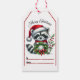 A charming Christmas tag featuring a racoon wearing glasses and a Santa hat, holding a wreath adorned with berries. Perfect for adding a whimsical touch to holiday gifts.