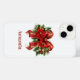 A phone case with a festive Christmas bow in red and gold. Surrounded by poinsettia flowers, pine and Christmas decorations.