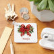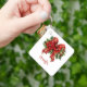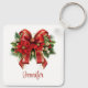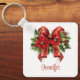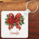 Personalised keychain with a festive Christmas bow in red and gold. Surrounded by poinsettia flowers, pine and Christmas decorations.