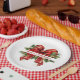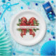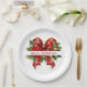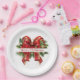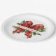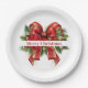 Paper plates with a festive Christmas bow in red and gold. Surrounded by poinsettia flowers, pine and Christmas decorations.