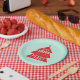 A cheerful and fun red Christmas tree spreads a message of holiday cheer with the message to "eat, drink and be merry" in fun and carefree typography. Use these aqua plates for your holiday dinner or a seasonal party.