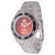 Has heft and feel of expensive stainless steel quartz watches. Good band with safety catch. I removed links, which is easy because engraved arrows show direction to push the linking pins. As always by this seller, the image (a railroad logo) is a perfect reproduction of my emailed image, and is precisely spaced and aligned.