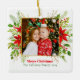 A beautiful red poinsettia floral with holly leaf and gold square surrounds your cute family photo above Merry Christmas. Bright and cheerful kids photograph holiday ornament gift with pretty flowers and leaves around your square picture.