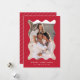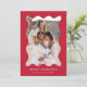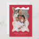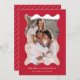 Send festive holiday greetings to your friends and family with this trendy holiday photo card! The simple Christmas card displays your vertical photo framed in a wavy, red retro-style frame. Personalise the minimal holiday card with a custom greeting (shown as Merry Christmas) and your family name in white lettering. The card reverses to display a red and white diagonal stripe pattern.