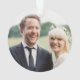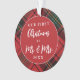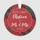 This holiday photo ornament features a festive red tartan pattern and text that says "Our first Christmas as Mr. & Mrs." with the year. The reverse side accommodates a one photo. A wonderful gift for any newlyweds!