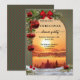 An artistic and festive Christmas dinner party invitation featuring a sunset over a winter landscape with pine trees, framed by a red and green polka dot pattern. Elegant greenery, snow and Christmas baubles complete the scene.