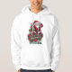 "Festive Santa Christmas hoodie. This vibrant hoodie design features a cheerful Santa Claus in his classic red suit and hat, holding a festive Christmas tree decorated with ornaments and lights. The central message reads, "Merry Harry Mars Christmas" surrounded by holiday-themed graphics, including pine branches, red ornaments, and a ribbon-style banner. The design radiates holiday spirit with its bold, bright colours and playful typography, making it a perfect festive choice for spreading Christmas cheer.