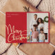 Celebrate the season with this festive script red photo Merry Christmas gold foil holiday card featuring a touch of elegant charm. The chic design showcases a simple gold-and-red colour palette, evoking the cosy spirit of winter. Its modern and unique appeal and rustic wording create a perfect balance between luxury and contemporary. In a casual and minimalist lettering style, the cheerful calligraphy adds a touch of flair. Share the joy and happiness of the holidays with this happy and stylish greeting!