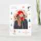 Festive holiday greeting card featuring your arched photo surrounded by colourful skiers, stars, and pine trees. Personalise the front of the photo Christmas card with your custom greeting (currently shown as "Merriest Christmas"), family name, and year in red lettering. Add your custom message to the inside of the card or leave it blank to write your own. The back of the ski-themed holiday card displays a red and white snowball pattern.