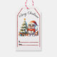 This whimsical Christmas tag showcases a cheerful snowman beside a decorated tree and colourful gifts, perfect for adding a joyful touch to holiday presents.