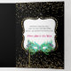 Festive Masquerade Ball Sweet 16 birthday party Tri-fold invitation done in black, with graphics of golden glitter and colourful ornate face masks. Gold framed white text areas have fully custom text ready to personalise, for your event. Great for birthday parties, Masquerade Parties, Halloween, Carnival, and Mardi Gras.