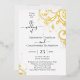 Festive and fanciful real foil and white wedding invitations. Decorative swirls with leaves and roses, and beautiful fonts with swirl ligatures. Simple, modern and classic clean wedding invitation, with your custom photo, black and white swirls and wedding details and further information on the back side of the card.
