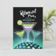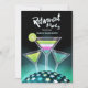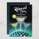 Simple and modern Retirement party invitation in aqua, and teal with fun colourful coctail glasses standing over star filled ball with spotlight. Text on front and back is ready for your customisation.