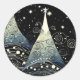 Festive Twilight Christmas trees with intertwining whimsical swirls and twinkling distant stars. Dark background with emerald, green highlights. Showcases vibrant Christmas trees reaching towards the night sky. The colours are swirled around the tree creating a sense of movement. There are stars scattered throughout the sky against a dark backdrop giving Festive Twilight Christmas Trees an ethereal quality.
