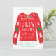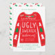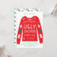 An ugly sweater with a touch of ugly designing in traditional red and green complete with christmas trees and mistletoe for your holiday party.