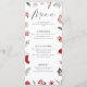 The menu card is adorned with red, white and green, Christmas themed watercolor illustrations, such as stockings, gifts, hot chocolate, candy cane, ornaments and others, that dance playfully around the edges, creating a festive and charming frame. These delightful illustrations evoke the spirit of the holidays, adding a whimsical touch to your menu.