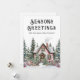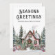 Send warm wishes this season with this professional watercolor Christmas card, featuring a cosy winter cabin nestled among pine trees and holly berries. The snow-covered cabin, complete with a wreath on the door and smoke rising from the chimney, sits along the bottom of the design—adding a festive and wintry touch to your holiday message.