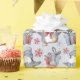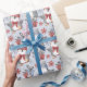 A festive and fun pattern with dancing penguins in winter hats and holiday gifts.