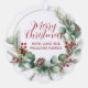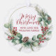A beautifully illustrated Christmas wreath featuring lush eucalyptus, pine sprigs, and vibrant red berries. The elegant red script “Merry Christmas” adds warmth and seasonal charm, while leaving space for the senders name, perfect for evoking holiday cheer and timeless celebration.