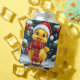A joyful yellow duckling wearing a Santa hat and red scarf amidst festive Christmas decorations and vibrant falling snow, capturing the cheerful and magical spirit of the winter holidays.